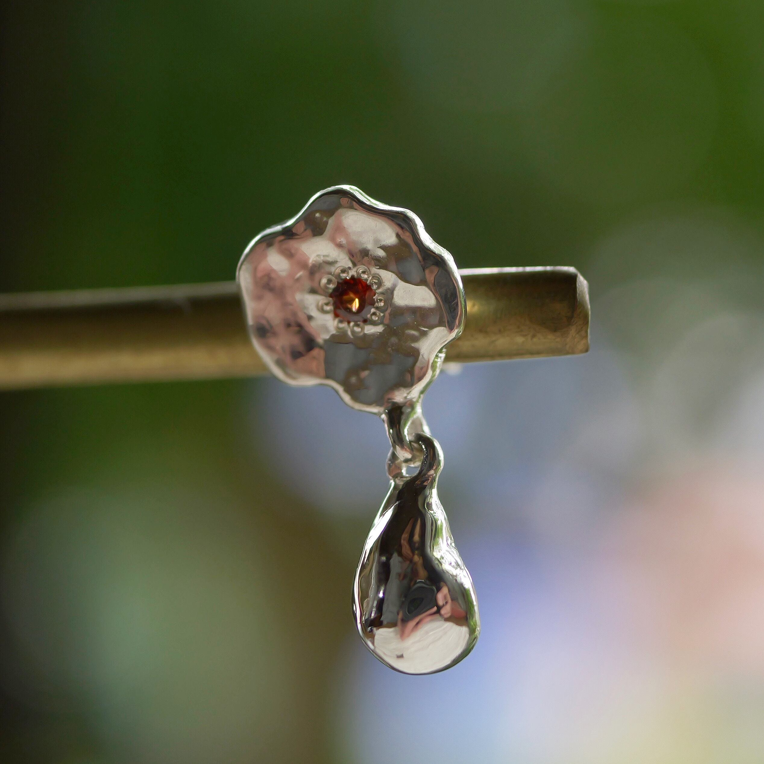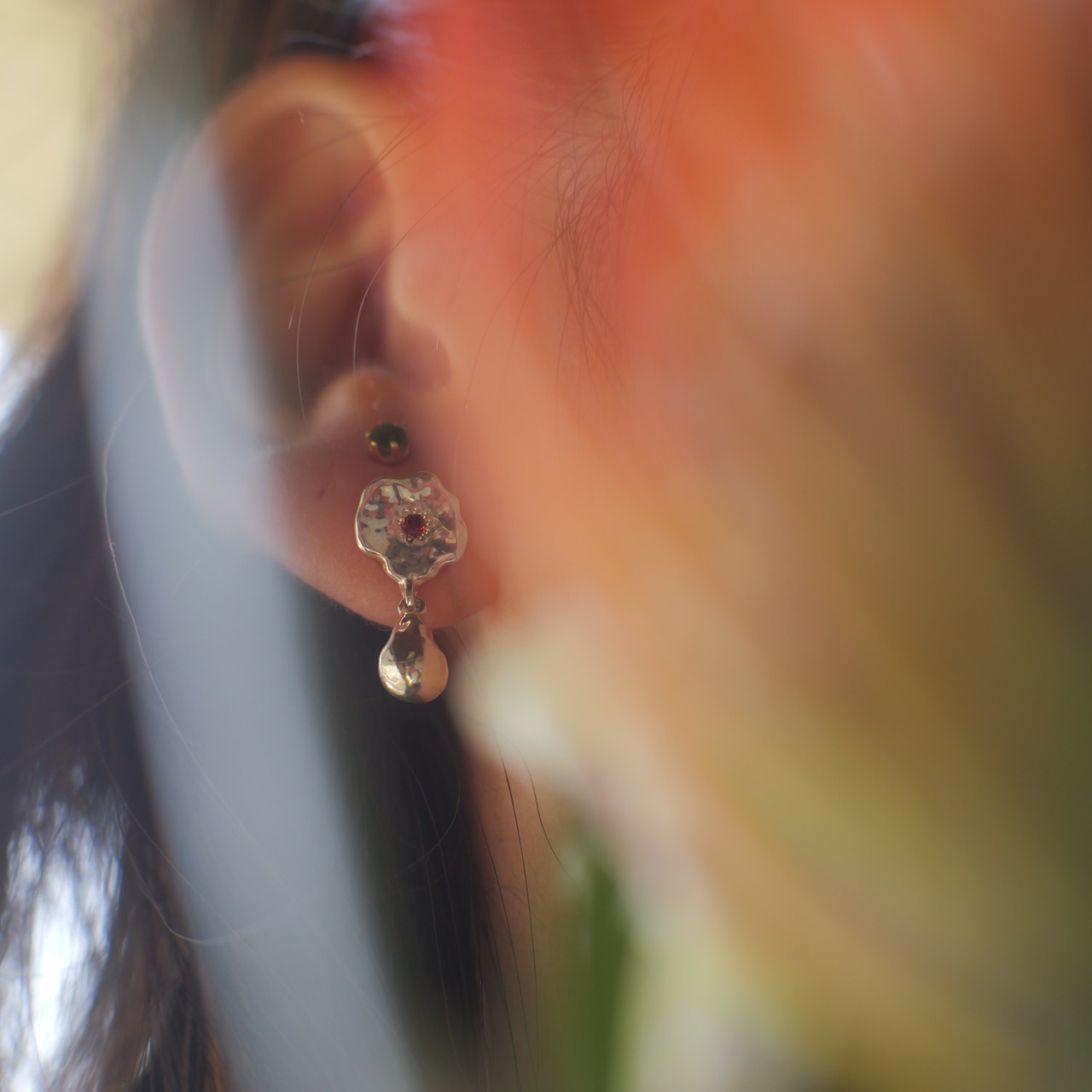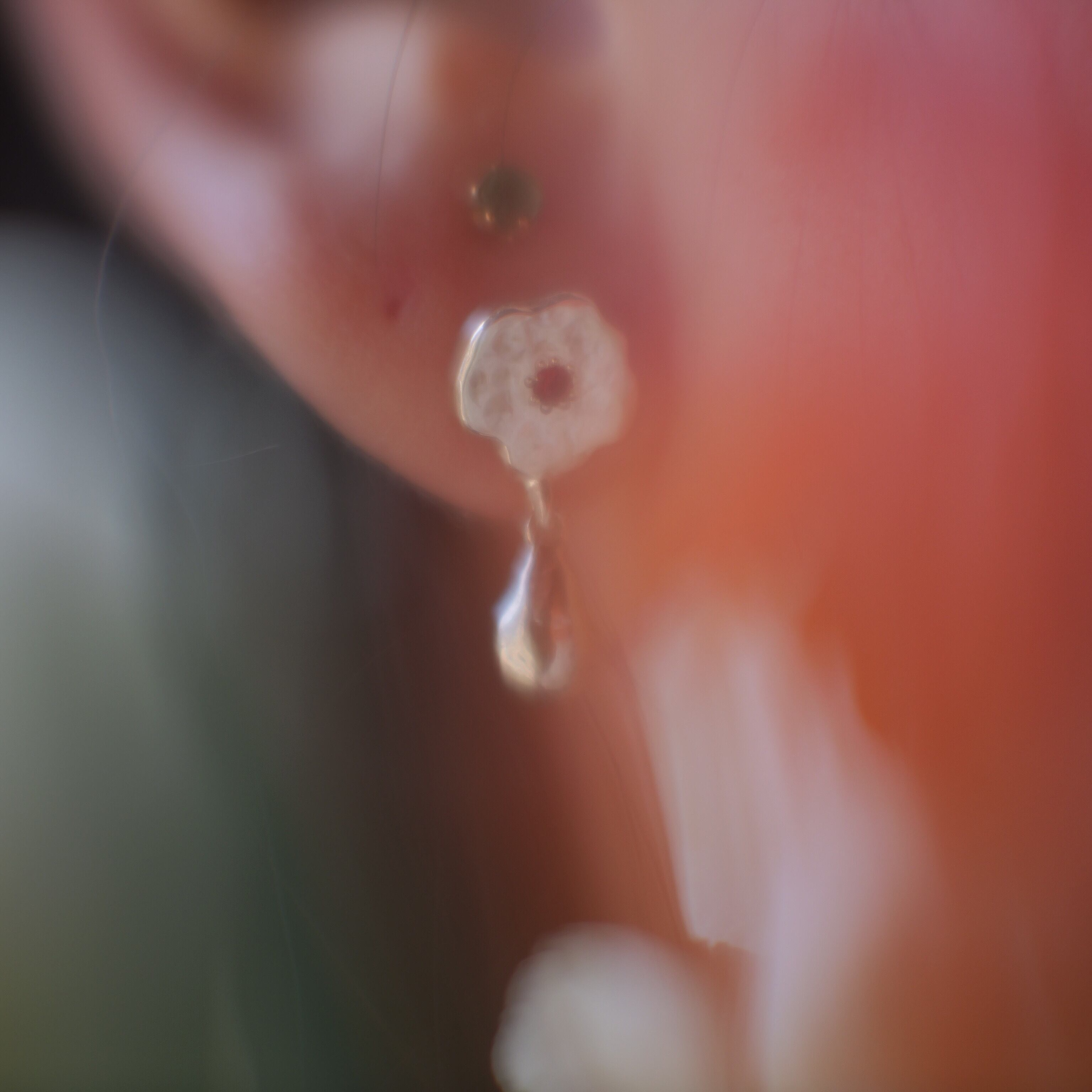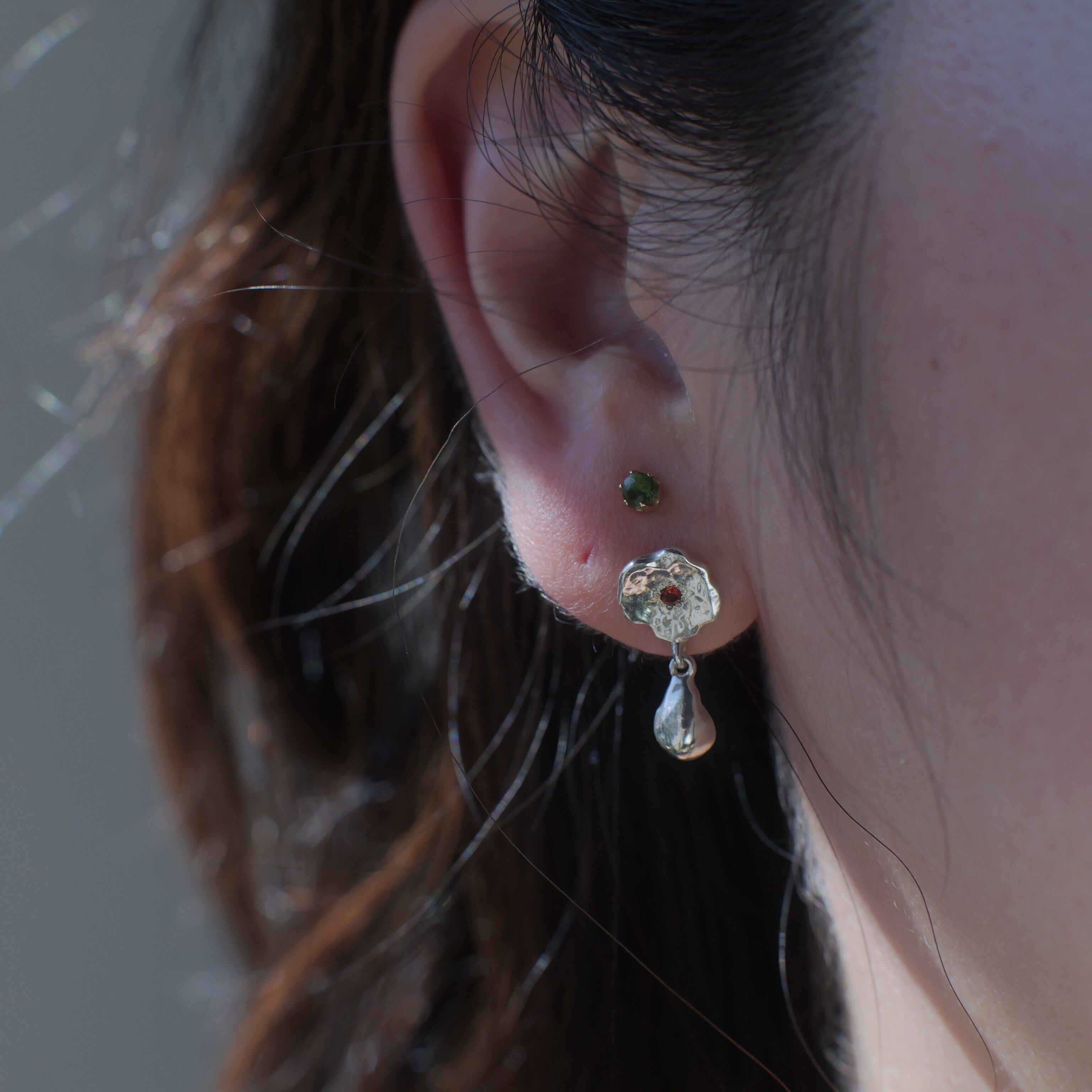 槌目のテクスチャのようなお花に2mmのガーネットをミル留めしました。ミルのポコポコが雄蕊のよう。シルバーの雫が色んな角度からチラリと見えて可愛いです。こちらは両耳用です。