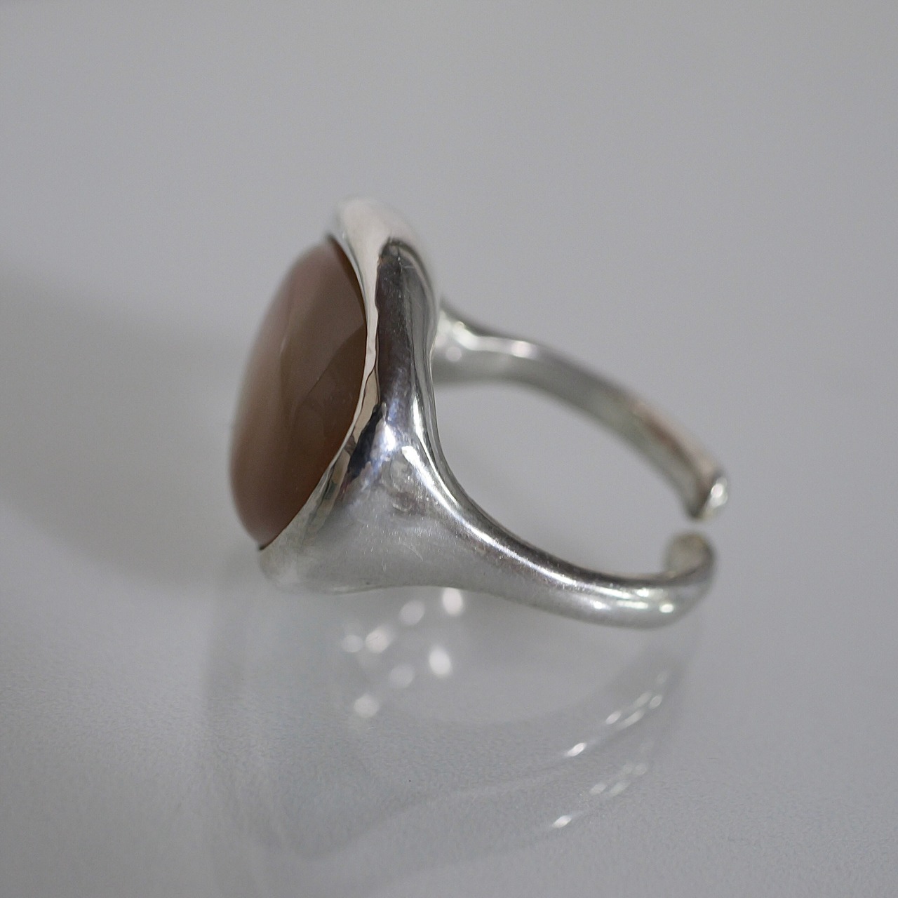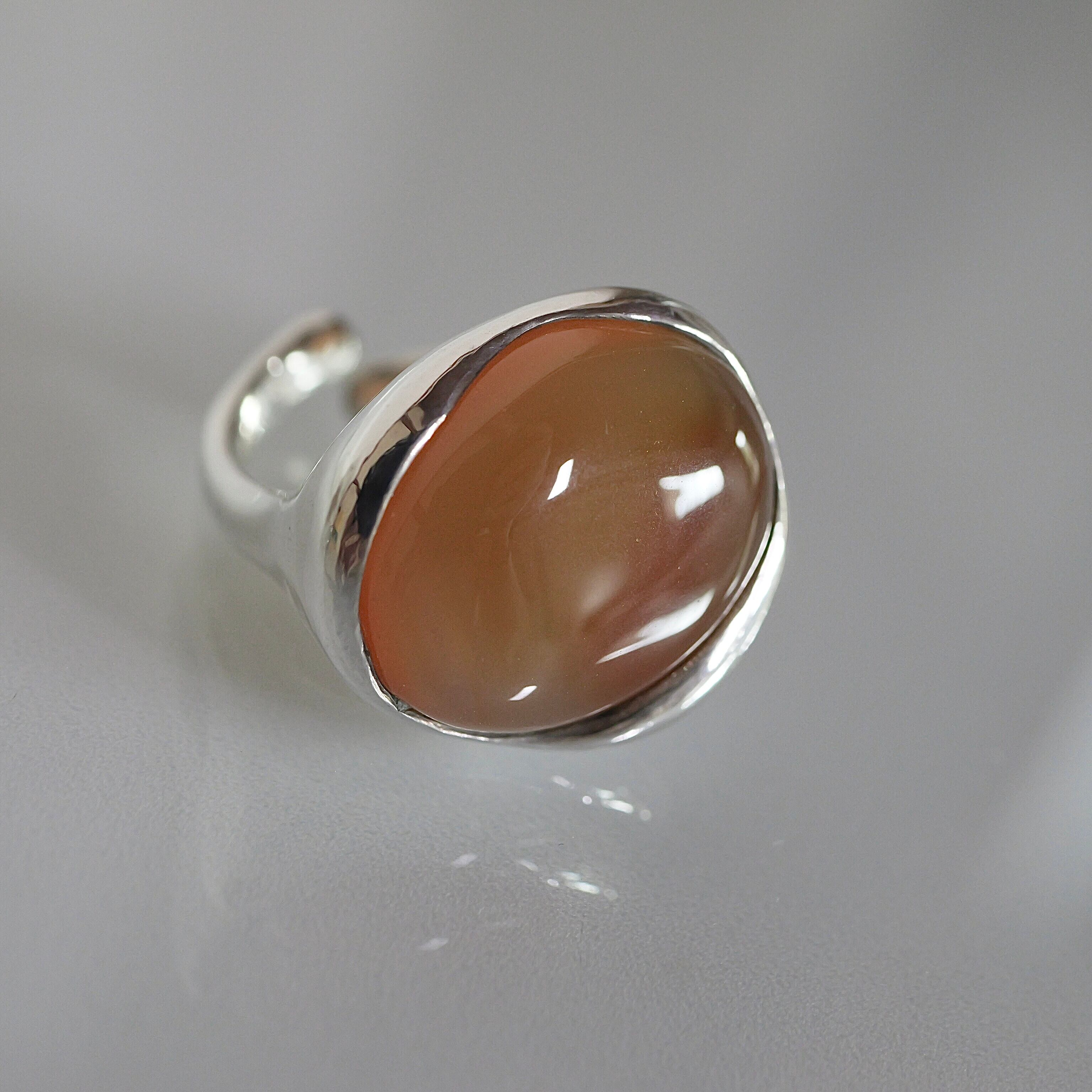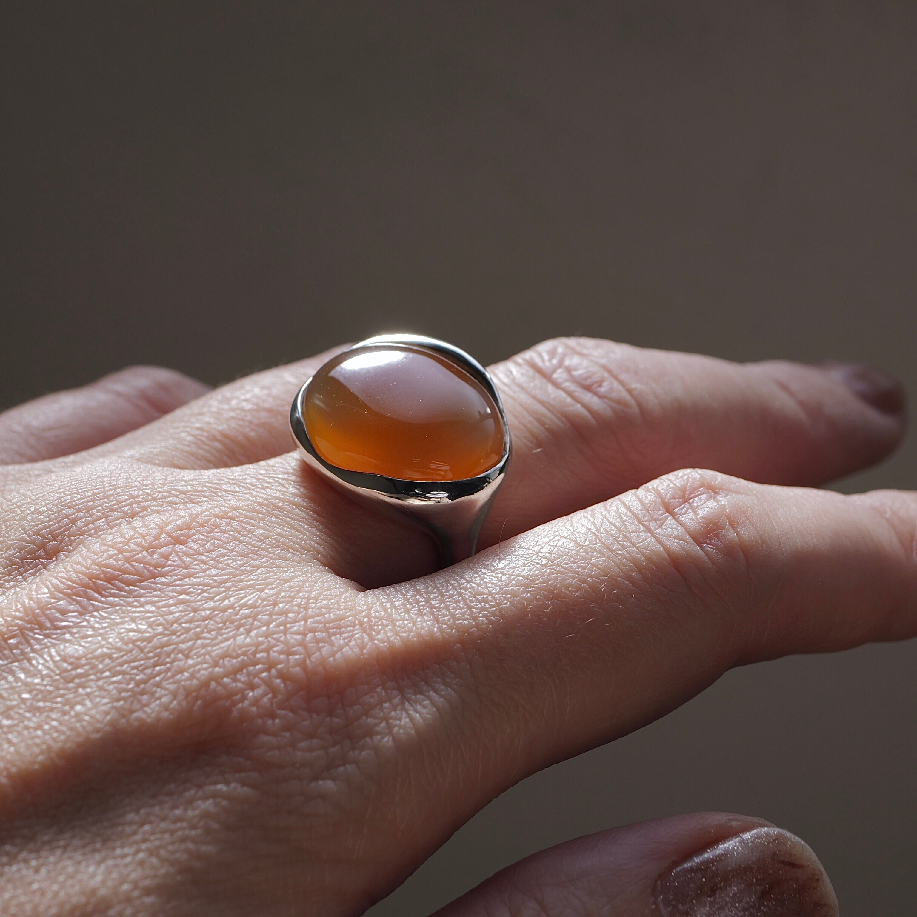 キャンディのようで美味しそうでファンシーですが少しくすんだ色みなので肌馴染みが良く合わせやすいです。石枠はシンプルながら曲線とボリューム感が個性的です。フリーサイズでのおつくりです。