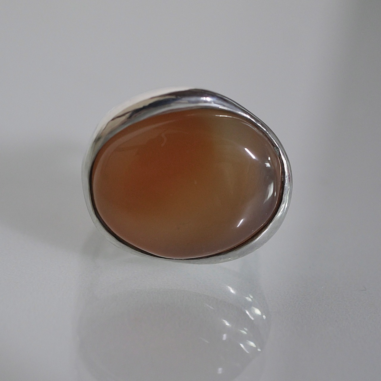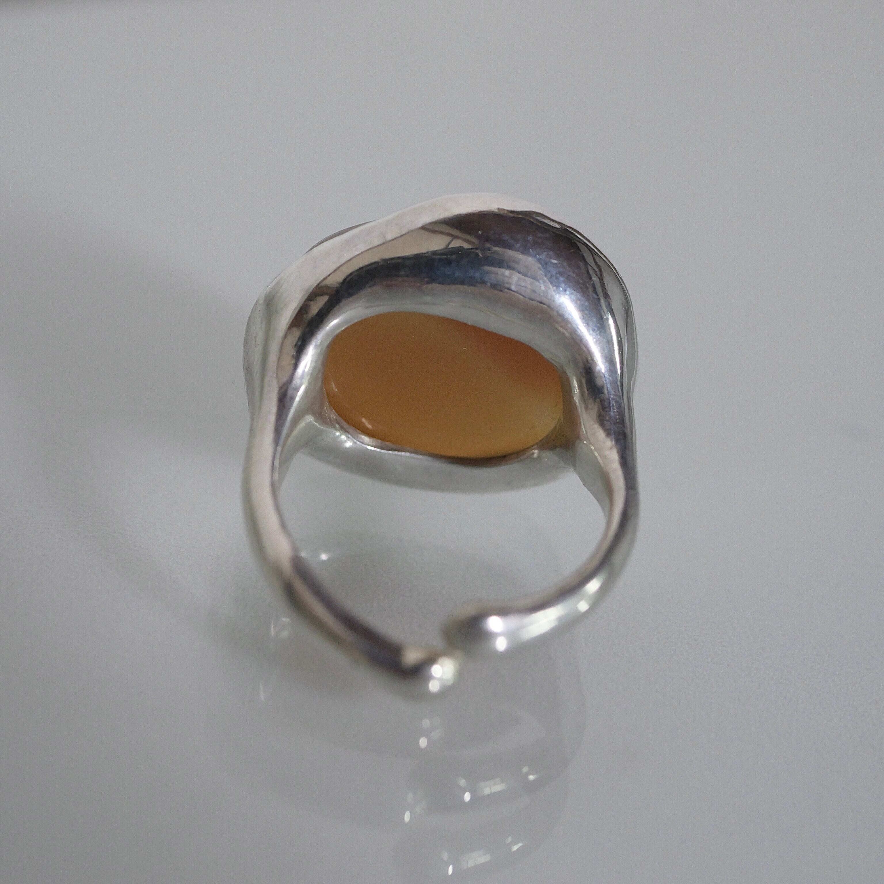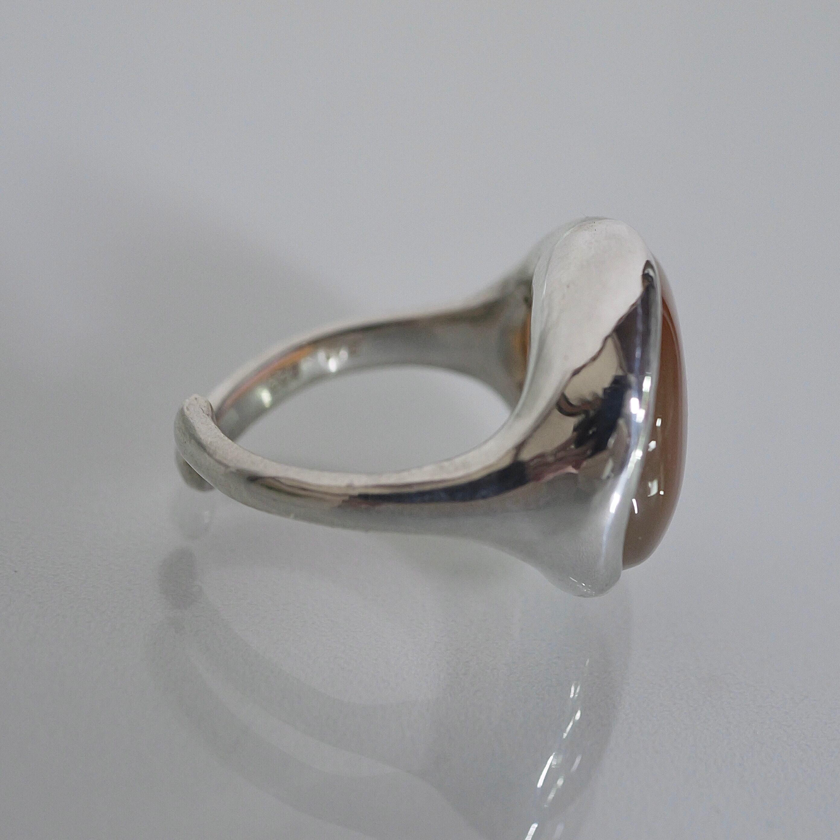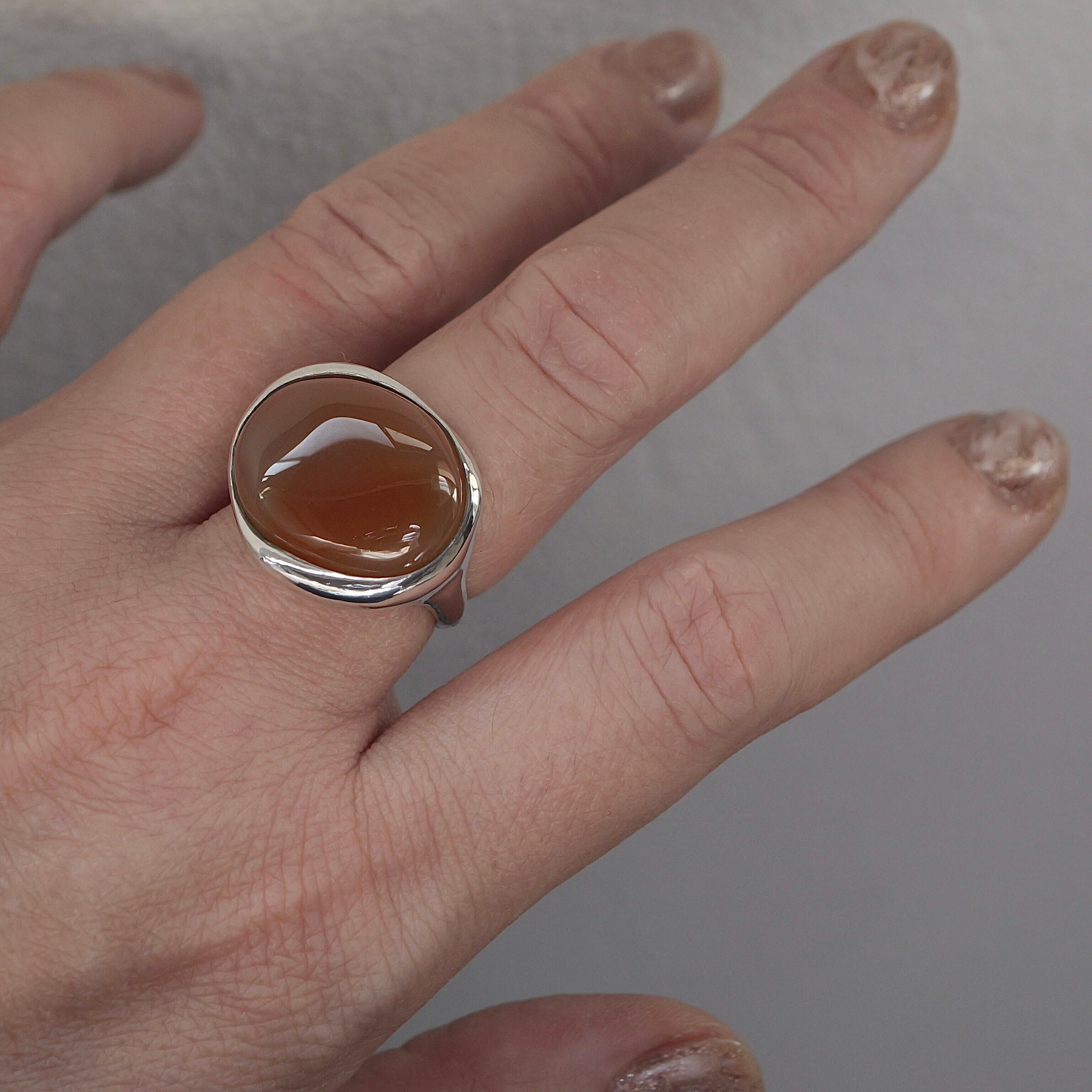 キャンディのようで美味しそうでファンシーですが少しくすんだ色みなので肌馴染みが良く合わせやすいです。石枠はシンプルながら曲線とボリューム感が個性的です。フリーサイズでのおつくりです。