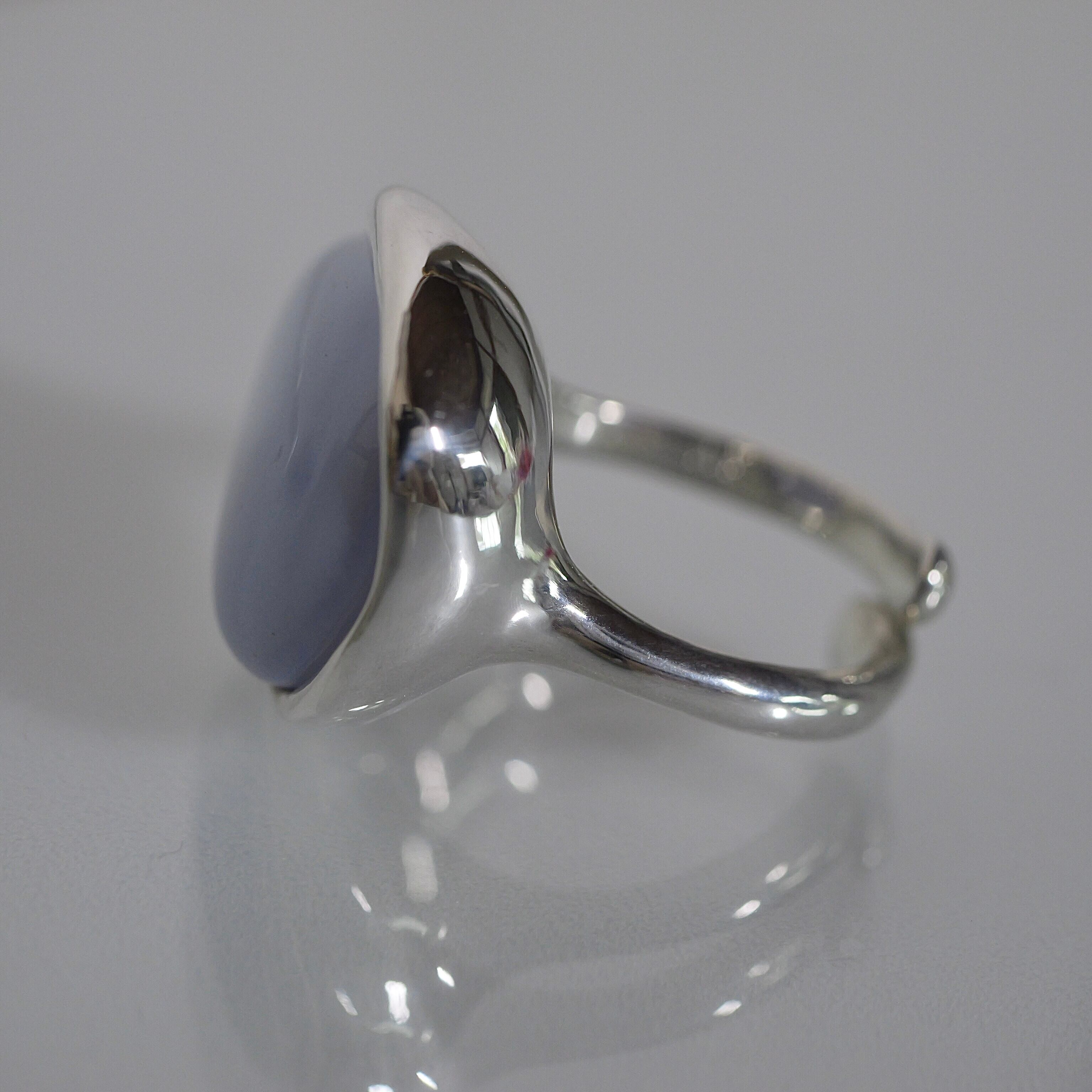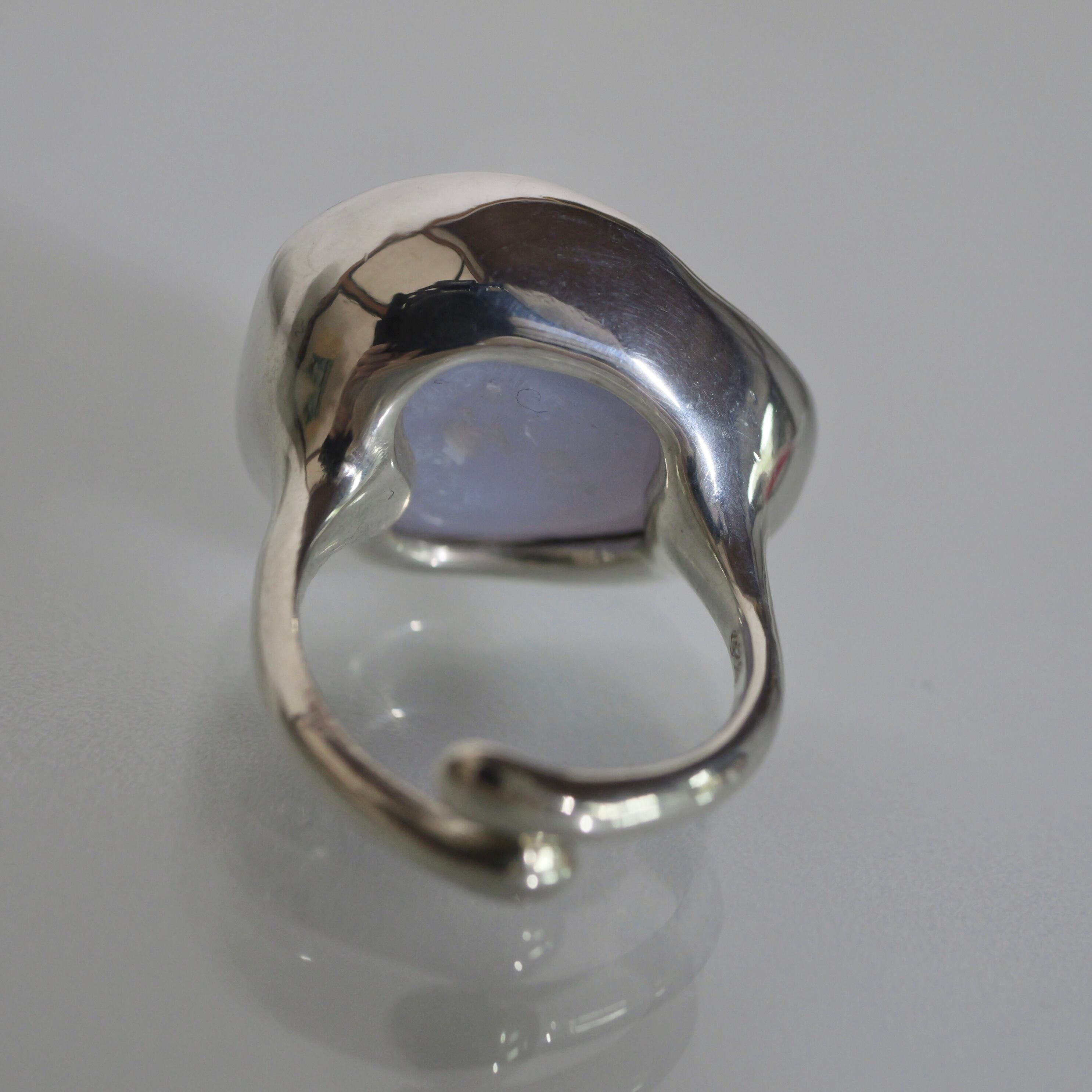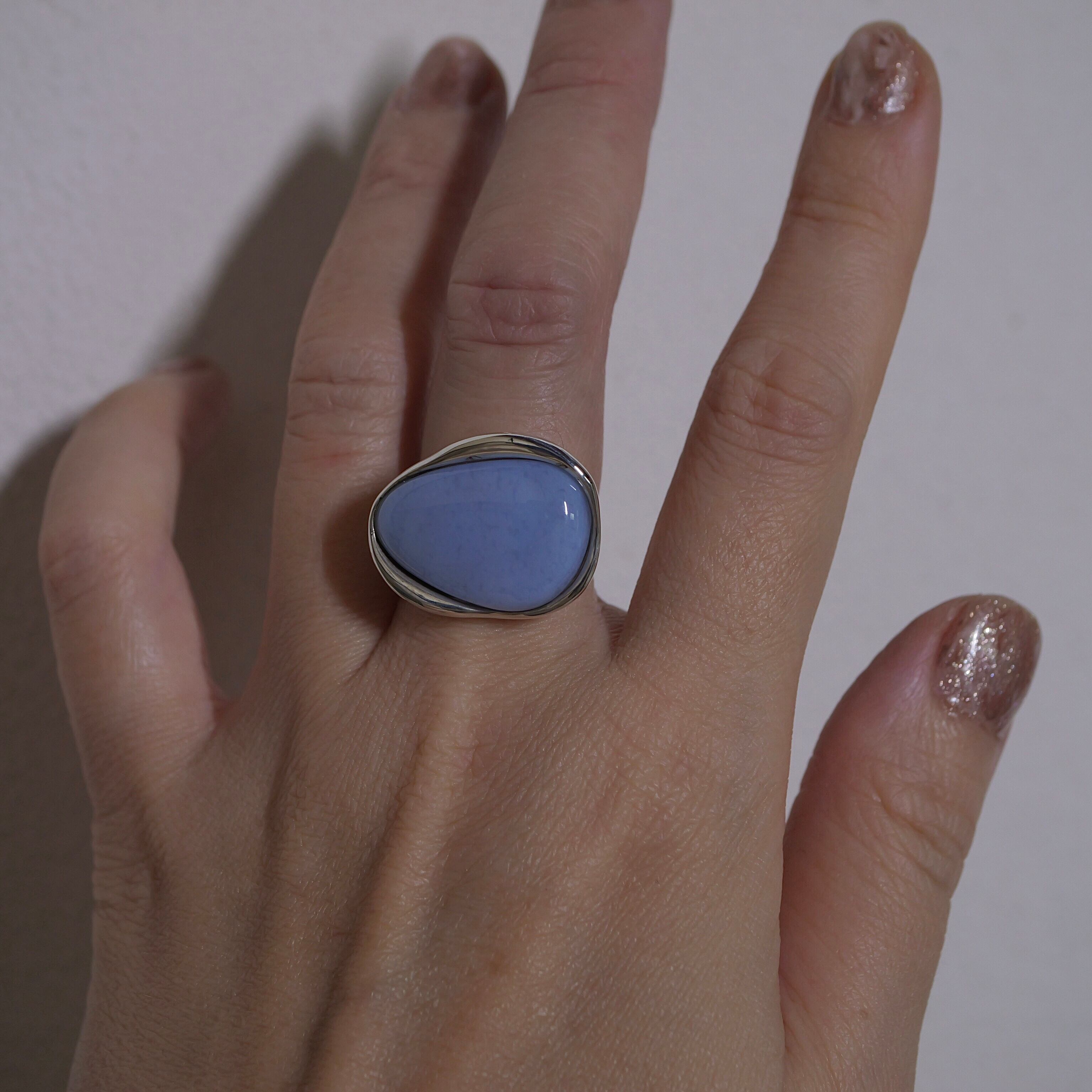 淡い色味のお洋服やアースカラー、ブラックにも相性が良いです。石枠はシンプルながら曲線とボリューム感が個性的です。フリーサイズでのおつくりです。